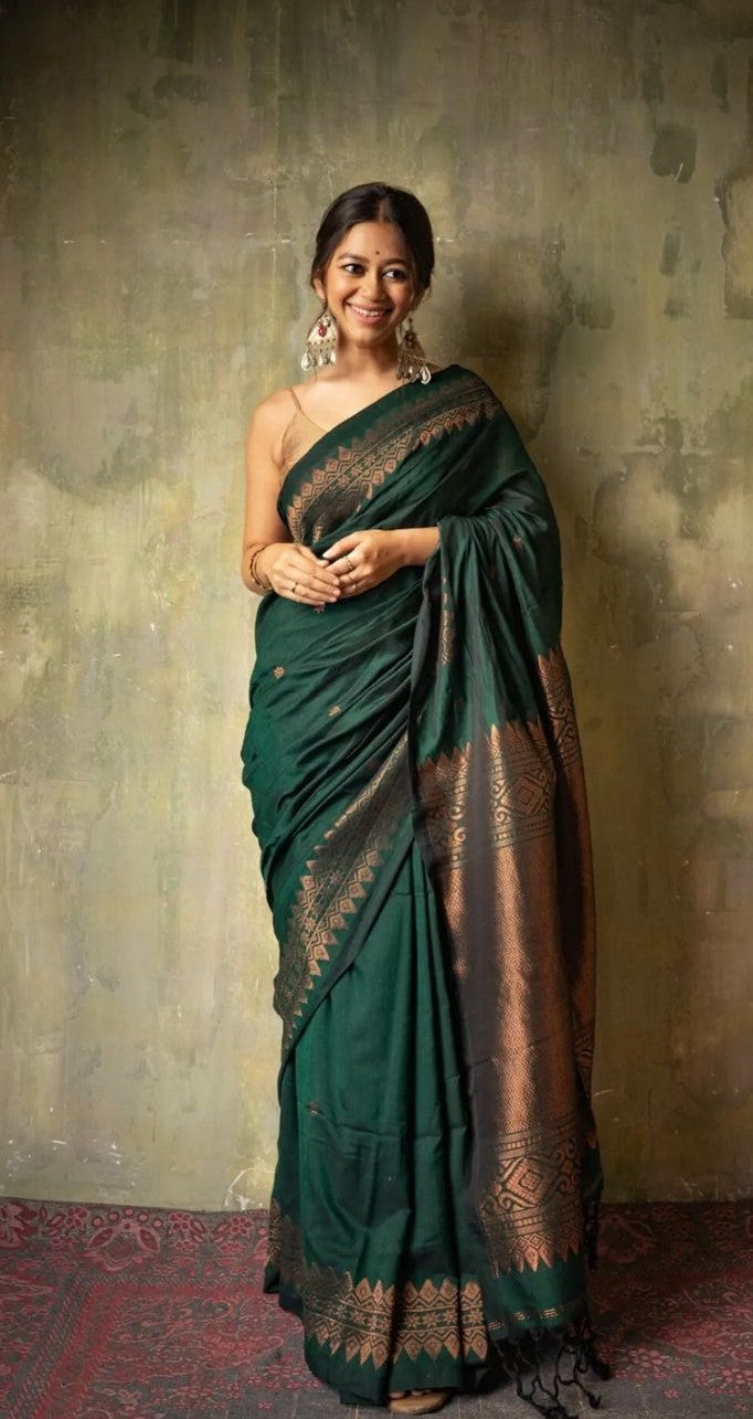 Step into elegance with this Green Jacquard Saree, crafted for women who love timeless beauty with a touch of luxury. The vibrant green shade symbolizes freshness and grace, making it a perfect choice for festive functions, weddings, cultural events and traditional celebrations.