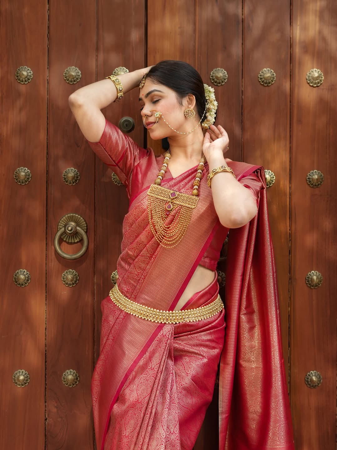 Elegant Red Jacquard Saree for Women | Rich Woven Design, Festive & Wedding Wear