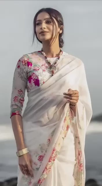Women`s New Linen Digital Printed Saree with Blouse