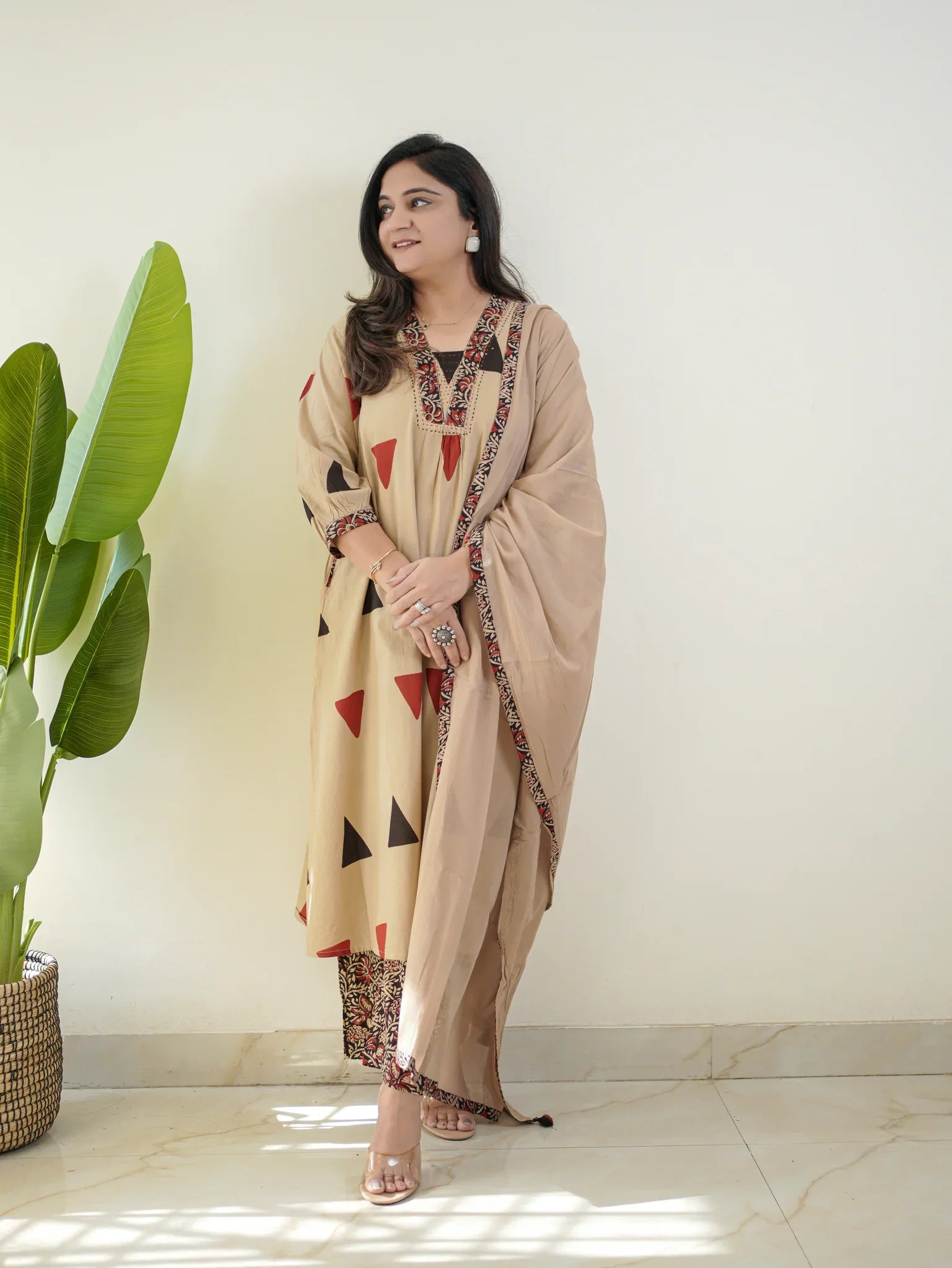 Pure Cotton Kalamkari A-Line Suit with Palazzo & Dupatta