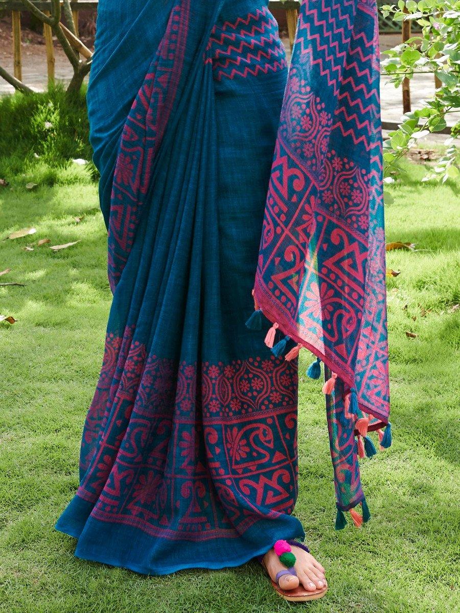 Pure linen saree in hues of blue colour