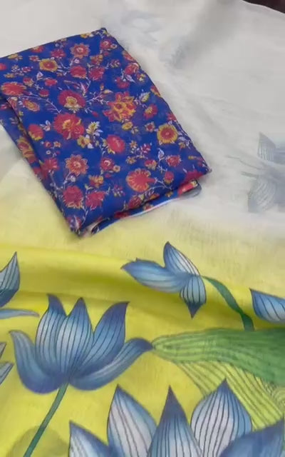 White And Green Party Wear Digital Painted Saree, With Blouse