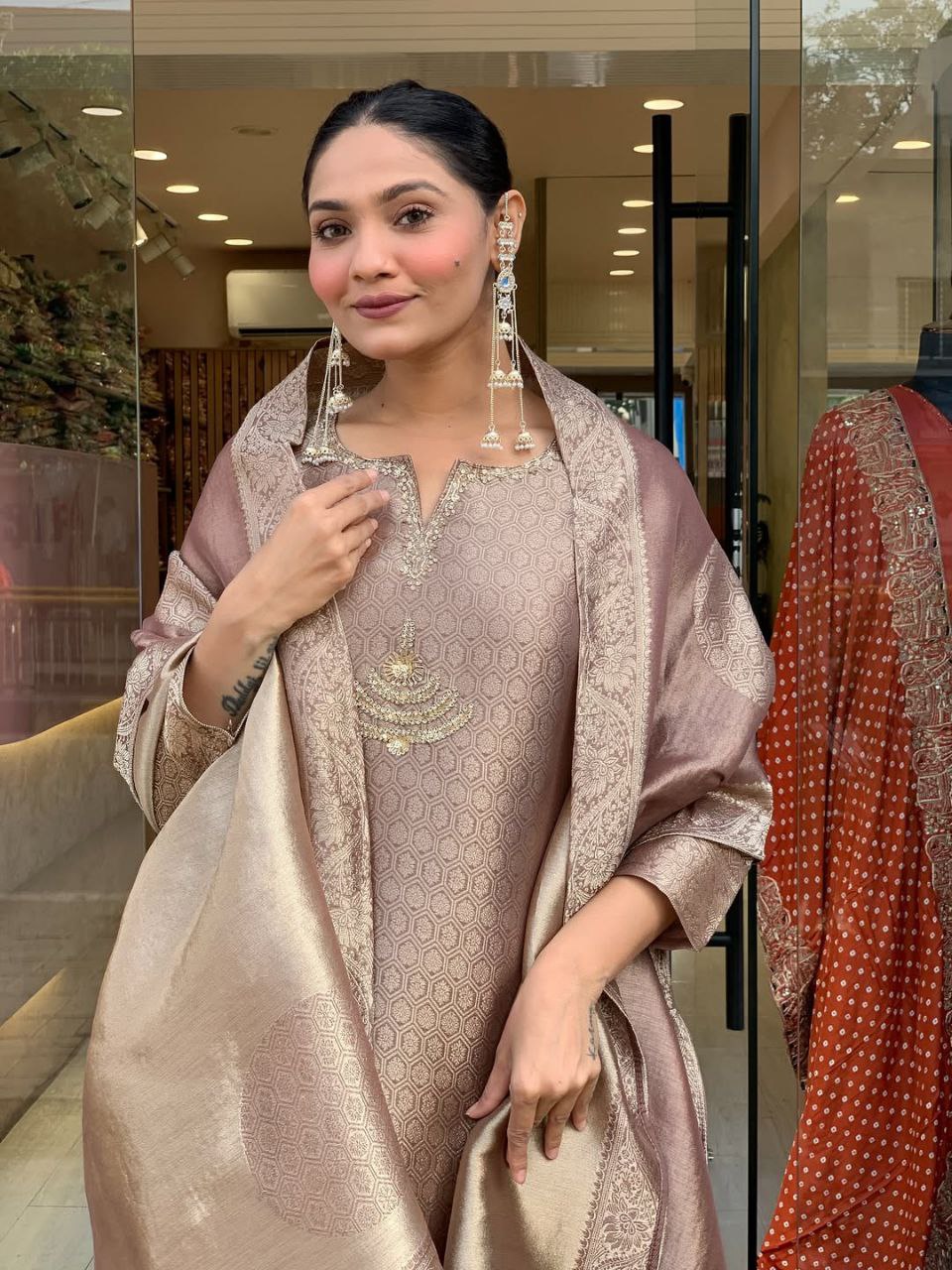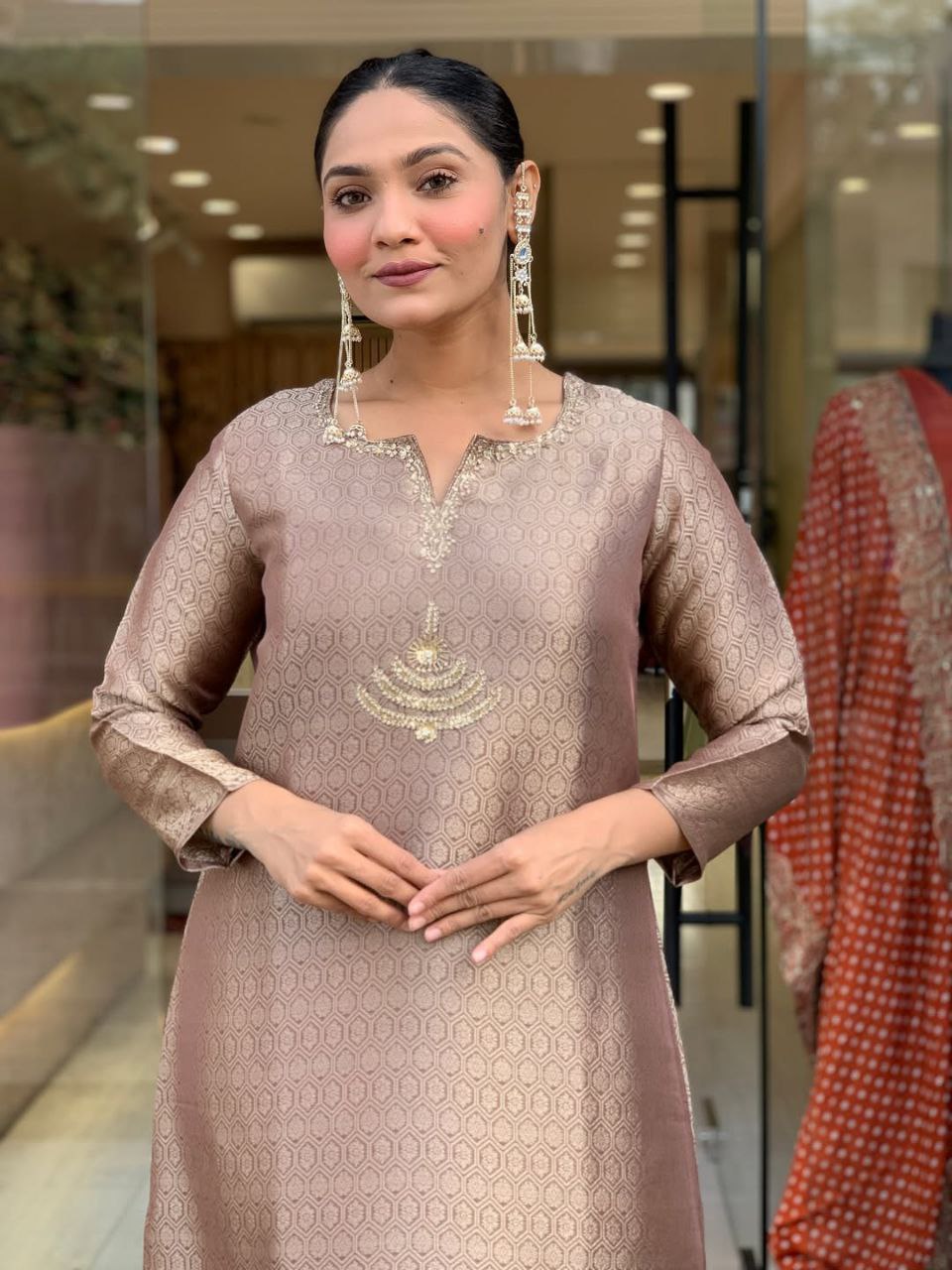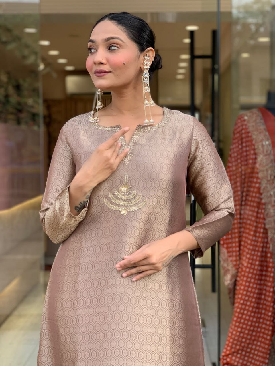 Add timeless elegance to your ethnic wardrobe with this beautiful Banarasi Silk Suit Set, designed for women who love traditional style with a modern touch. Crafted from premium Banarasi fabric, this outfit features intricate woven patterns that give it a rich and luxurious look. The straight-cut kurta showcases delicate traditional motifs and fine detailing around the neckline, offering a graceful and sophisticated appearance. It is paired with matching straight pants and a luxurious Banarasi dupatta with elegant borders, completing the perfect festive ensemble. The soft texture and comfortable fit make this suit set ideal for festive occasions, weddings, family gatherings, and cultural celebrations. Style it with statement earrings and traditional footwear for a classy ethnic look.
